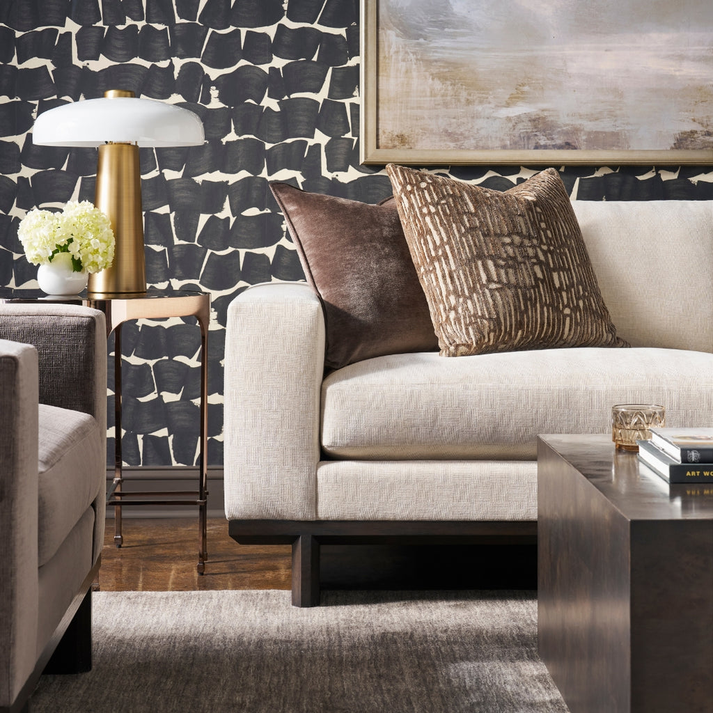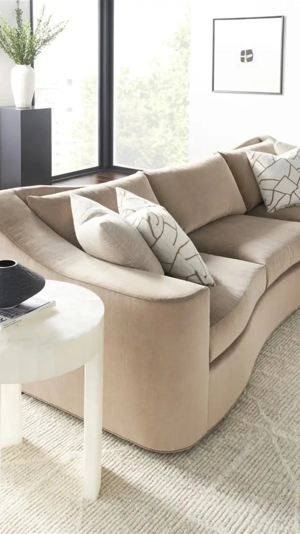 Modern beige armchair with a black side table and geometric vase against a dark curtain background