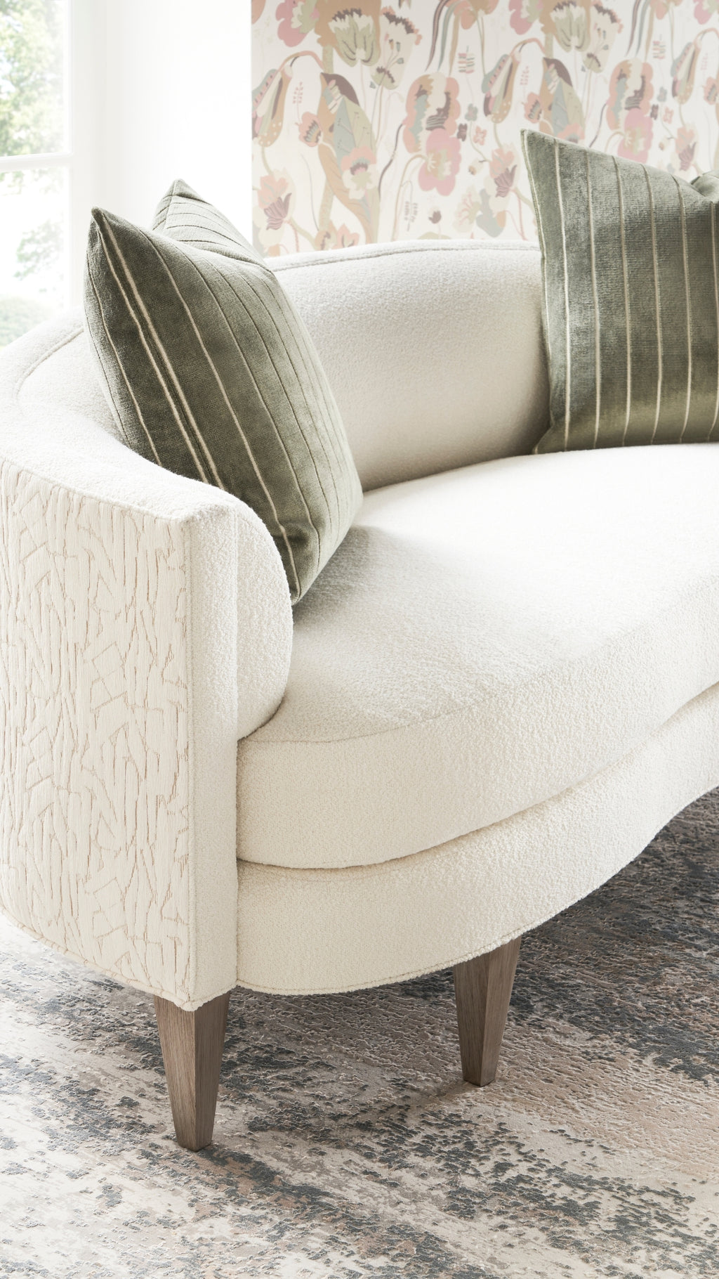 The Dali Sofa showcases graceful, flowing curves across its layered back and sides, creating a calm and inviting presence. Upholstered in a subtly textured alabaster fabric, its sinuous silhouette blends modern elegance with exceptional comfort. Enveloping arms and a gently curved front give the sofa a light, floating appearance that enhances any space. Designed to elevate both style and relaxation, the Dali Sofa works beautifully as a statement piece or styled in pairs to encourage conversation and social connection.