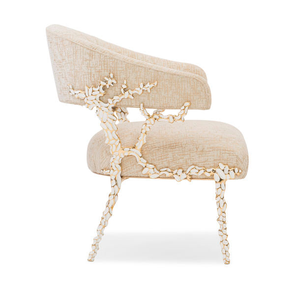 The Berlin Chair is a sculptural statement that effortlessly merges artistry with function, designed to elevate refined interiors. Its distinctive silhouette is inspired by the organic rhythms of nature, echoing the graceful movement of branching forms shaped over time. Crafted with a custom solid brass frame, the structure is finished in an elegant brushed gold tone and enhanced with subtle white enamel inlay, creating a luminous interplay of texture and light. The tight seat and back are upholstered in a sophisticated neutral fabric, offering a soft contrast to the chair’s architectural presence while ensuring lasting comfort. Bold yet balanced, this exceptional piece introduces a sense of modern opulence and quiet drama, making it an ideal accent for luxurious living spaces where design, craftsmanship, and individuality take center stage.