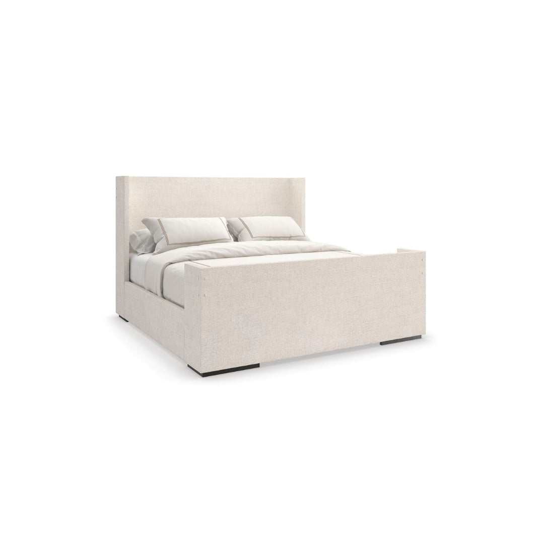 The Clement King Bed introduces a refined sense of comfort and sophistication, perfectly balancing form and function. Wrapped in a soft chenille fabric, its shelter style silhouette creates an inviting retreat, offering both elegance and warmth. The headboard, footboard, and side rails are fully upholstered, presenting a seamless, tailored look that enhances any bedroom setting. Decorative buttons add a subtle design element while concealing functional details, ensuring the piece maintains a polished, luxurious appearance. Resting on a striking plinth base in an Almost Black finish, the bed gains a dramatic contrast that grounds its serene presence. A brushed stainless touch provides an additional layer of modern refinement. With its thoughtfully finished headboard back, the Clement King Bed is designed to float gracefully in a room, allowing versatile placement and visual impact. More than a place to rest, it becomes a statement piece, combining contemporary lines with timeless appeal.