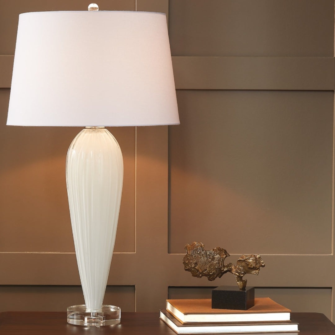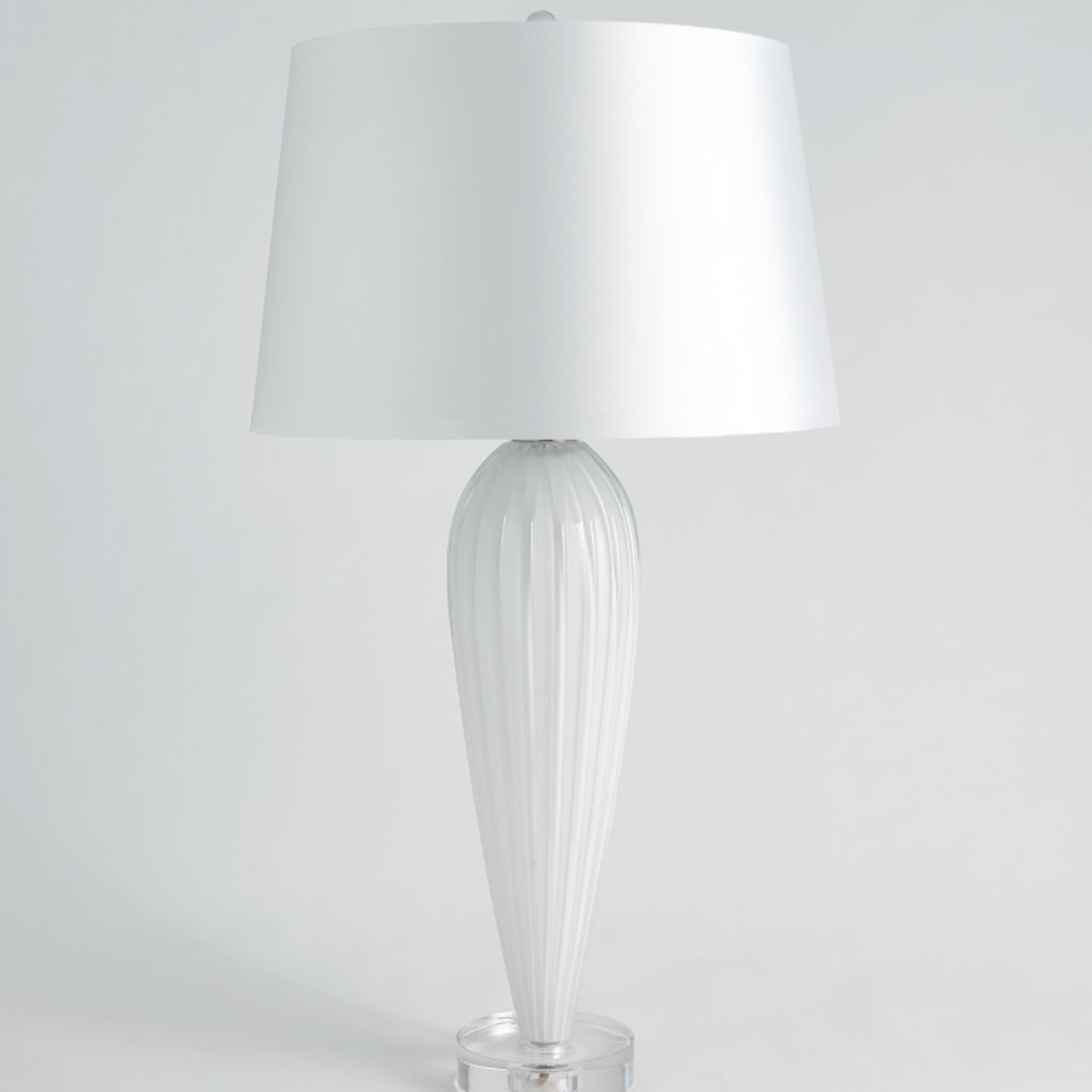 The Thera Glass Lamp brings a refined, luminous elegance to any sophisticated interior. Its mold formed glass body creates a smooth, sculptural silhouette that catches the light beautifully, offering a subtle glow even when not illuminated. Resting on a clear crystal base, the lamp gains an added layer of transparency and brightness, enhancing its clean, modern aesthetic. A polished nickel finish introduces a cool metallic accent that complements the glass while adding contemporary flair. The piece is topped with a round white linen shade featuring a rolled edge, ensuring soft, even diffusion and a timeless, tailored look. Designed for practical use as well as style and includes a socket switch for easy lighting control. Perfect for bedrooms, living rooms, or elegant office spaces, the Thera Glass Lamp blends clarity, texture, and sophistication making it an ideal choice for interiors seeking understated luxury and enduring grace.