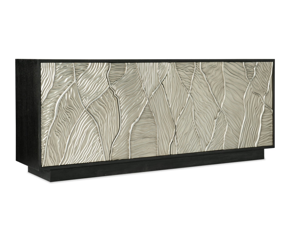 Apportez une touche de glamour hollywoodien à votre intérieur avec la crédence Ayers. Ce meuble remarquable arbore une élégante finition en bois noir, rehaussée de façades de portes argentées aux dimensions généreuses, réalisées en placage de chêne et résine. Quatre portes profilées à loquet tactile dissimulent un vaste espace de rangement, chacune avec une étagère réglable. Idéale comme buffet ou meuble de divertissement, la crédence Ayers peut accueillir un téléviseur jusqu'à 80 pouces. Un panneau arrière ventilé avec passe-câbles et passe-mains, ainsi qu'un bloc d'alimentation intégré, assurent une intégration parfaite avec vos appareils électroniques. Cette magnifique crédence offre un mélange éclectique de couleurs, de textures et de matériaux, ce qui en fait un élément central de tout salon ou salle à manger.