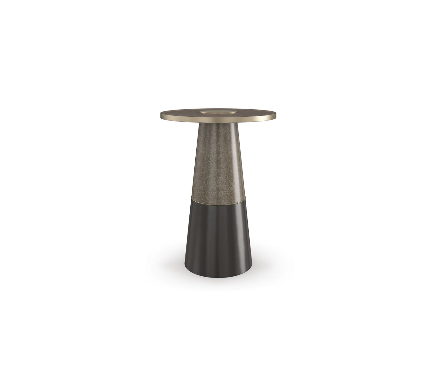 The Monroe Side Table in brushed gold is a distinctive accent piece that blends artistic detail with modern sophistication. Its smoked bronze glass top, framed by a refined metal edge and centered with a brushed gold disc, creates a striking focal point reminiscent of a camera aperture when viewed from above. The sculptural base features a unique combination of finishes, with an upper column in Forest Craze crackle adding depth and organic texture, while the lower portion in Seal Skin introduces a smooth, grounding contrast. A brushed gold band elegantly unites these elements, enhancing the table’s cohesive and polished look. Compact yet visually impactful, this versatile piece fits effortlessly between seating arrangements, offering both function and design appeal. With its layered materials and thoughtful composition, the Monroe Side Table brings a sense of artistry and contemporary luxury to any interior setting.