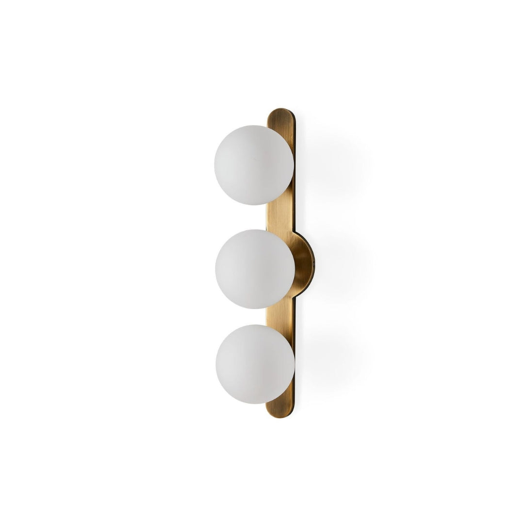 The Peyton Sconce offers a contemporary twist on mid century elegance, combining sleek geometry with warm, inviting finishes. Its frame, crafted in rich antique brass, supports five inch matte white opal globes that diffuse light beautifully, casting a soft, ambient glow. Designed with versatility in mind, the sconce can be mounted horizontally or vertically, making it perfect for bath vanities, hallways, or accent walls. The fixture accommodates three candelabra style bulbs, up to 60 watts each, delivering ample illumination while maintaining a sculptural presence. The juxtaposition of classic mid century form with modern details creates a piece that feels both timeless and fresh, seamlessly complementing contemporary and transitional interiors alike. Thoughtfully designed, the Peyton Sconce transforms functional lighting into an artful statement, enhancing any space with elegance, sophistication, and understated glamour, making it an ideal choice for those who value both style and quality in their décor.