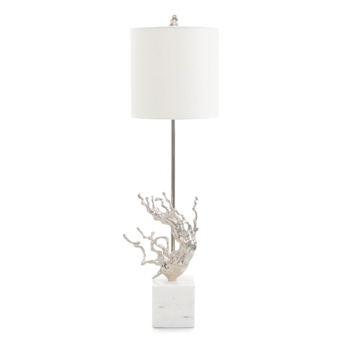The Madura Table Lamp offers a captivating blend of elegance and artistry, bringing a touch of mystique to refined interiors. Its sculptural brass body, finished in a soft nickel sheen, features swirling, airy contours that evoke the fluid movement of rising smoke. This ethereal form creates a striking contrast against the grounded geometry of its squared white marble base, which provides a clean, polished foundation. Coordinating nickel hardware and an organically shaped finial echo the lamp’s flowing silhouette, ensuring visual harmony throughout the design. Perfect for a living room, bedside table, or sophisticated workspace, the Madura Table Lamp adds both illumination and a sense of quiet drama. Its unique combination of metallic texture, sculptural curves, and timeless materials makes it an exceptional accent for contemporary, transitional, or art forward spaces seeking depth, character, and understated luxury.