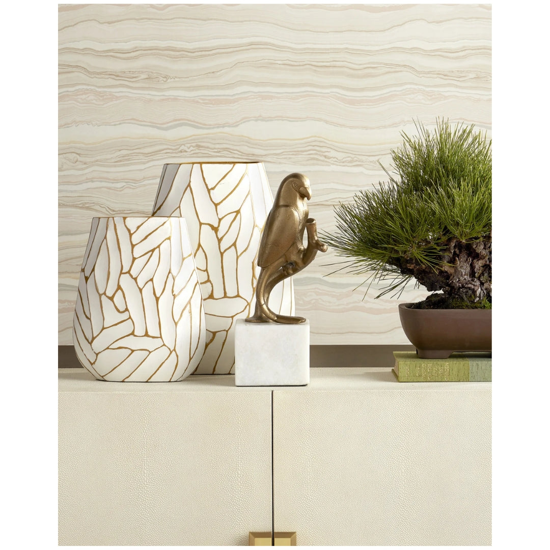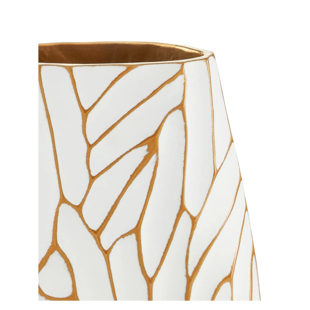 The Barrow White Vase Set of 2 is a sophisticated pairing that brings modern artistry and subtle opulence to any elegant interior. Crafted from cast aluminum, each vase showcases a dynamic interplay of texture and tone, with a hand applied white finish layered over a radiant gold base. The result evokes the look of an abstract painting, as though brushed with a palette knife to create movement and depth across the surface. Inside, the metallic gold finish mirrors the accents on the exterior, adding a warm glow that enhances the sculptural appeal. Perfect as standalone pieces or displayed together, these vases offer both visual contrast and cohesion. Whether placed on a console, dining table, or sideboard, the Barrow White Vase Set introduces a refined, contemporary statement to your décor an ideal balance of craftsmanship, texture, and understated luxury in white and gold tones.