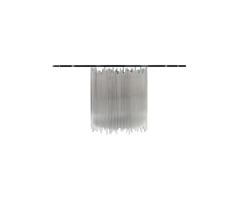 The Noemie Dining Table is a striking expression of contemporary elegance, designed to captivate from every angle. Its round glass top creates a luminous surface that reflects light beautifully, enhancing the sense of space and refinement within the room. Finished in a soft Silken Pearl tone, the table is elevated by subtle silver leaf accents that add depth and a refined shimmer without overwhelming the design. Thoughtful details reveal themselves gradually, from the delicately patterned surface inspired by modernized floral motifs to the distinctive hardware accented with sliced white agate, offering a touch of natural luxury. Supported by a sleek steel structure, the Noemie Dining Table balances strength and sophistication with ease. Perfectly suited for intimate dinners or elegant gatherings, it brings glamour and modernity together in a harmonious composition. This table is designed for those who appreciate refined craftsmanship and understated opulence that unfolds over time.