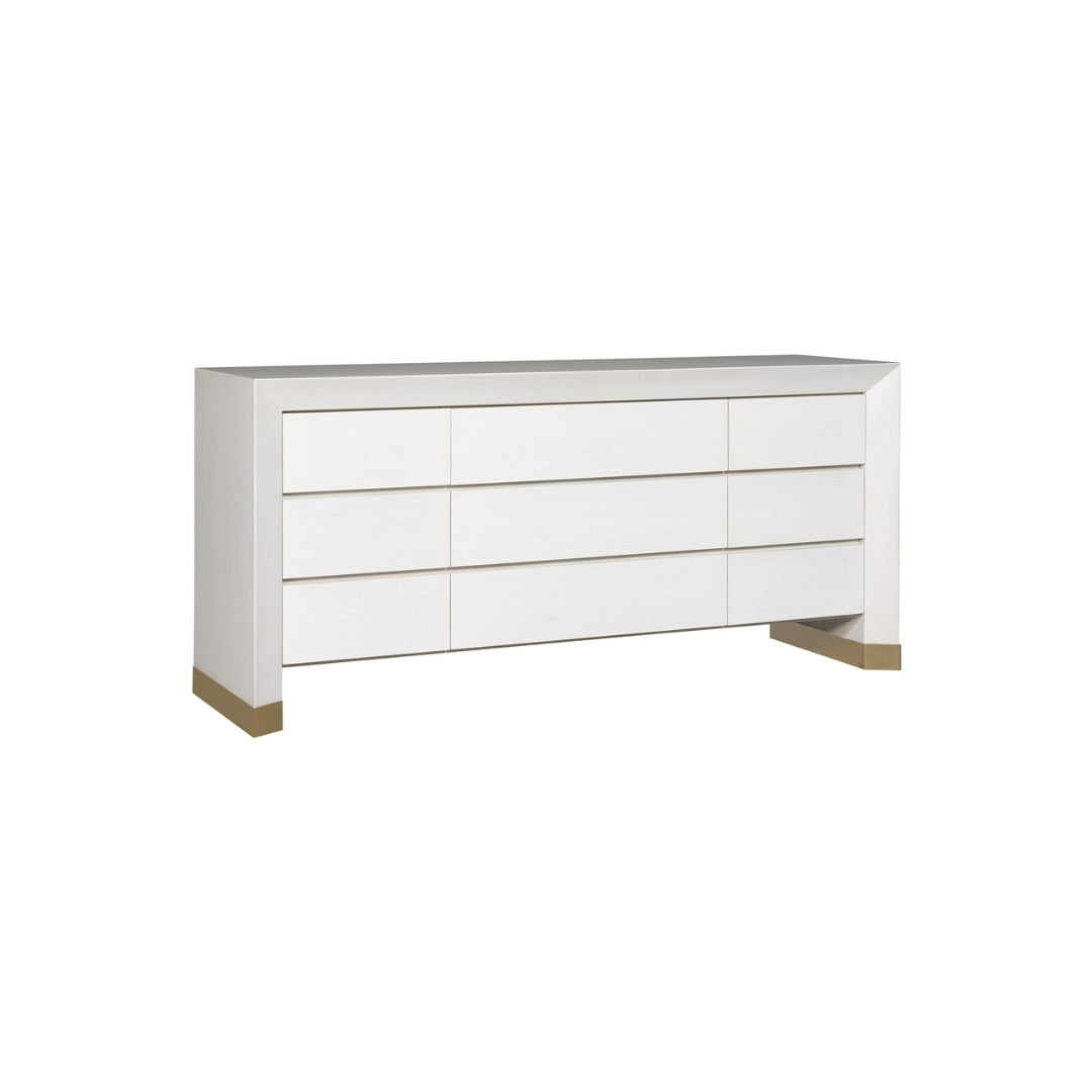 The Audrey Dresser embodies understated luxury through refined craftsmanship and thoughtful design. Finished in a soft Sugar Coat tone, its elegant presence brings brightness and calm to any bedroom setting. Clean lines and balanced proportions create a timeless silhouette, while nine spacious drawers offer generous storage without compromising visual harmony. Each drawer is designed with integrated finger groove pulls, preserving a seamless façade and emphasizing the dresser’s minimalist sophistication. Subtle white bronze ferrules add a quiet contrast at the base, introducing a delicate metallic accent that elevates the overall aesthetic. Free from visible hardware, the Audrey Dresser celebrates purity of form and meticulous detail, allowing material, finish, and construction to take center stage. Equally suited to contemporary or transitional interiors, this piece blends function with refined style, making it an enduring addition to a well curated space where elegance is expressed through restraint and quality.