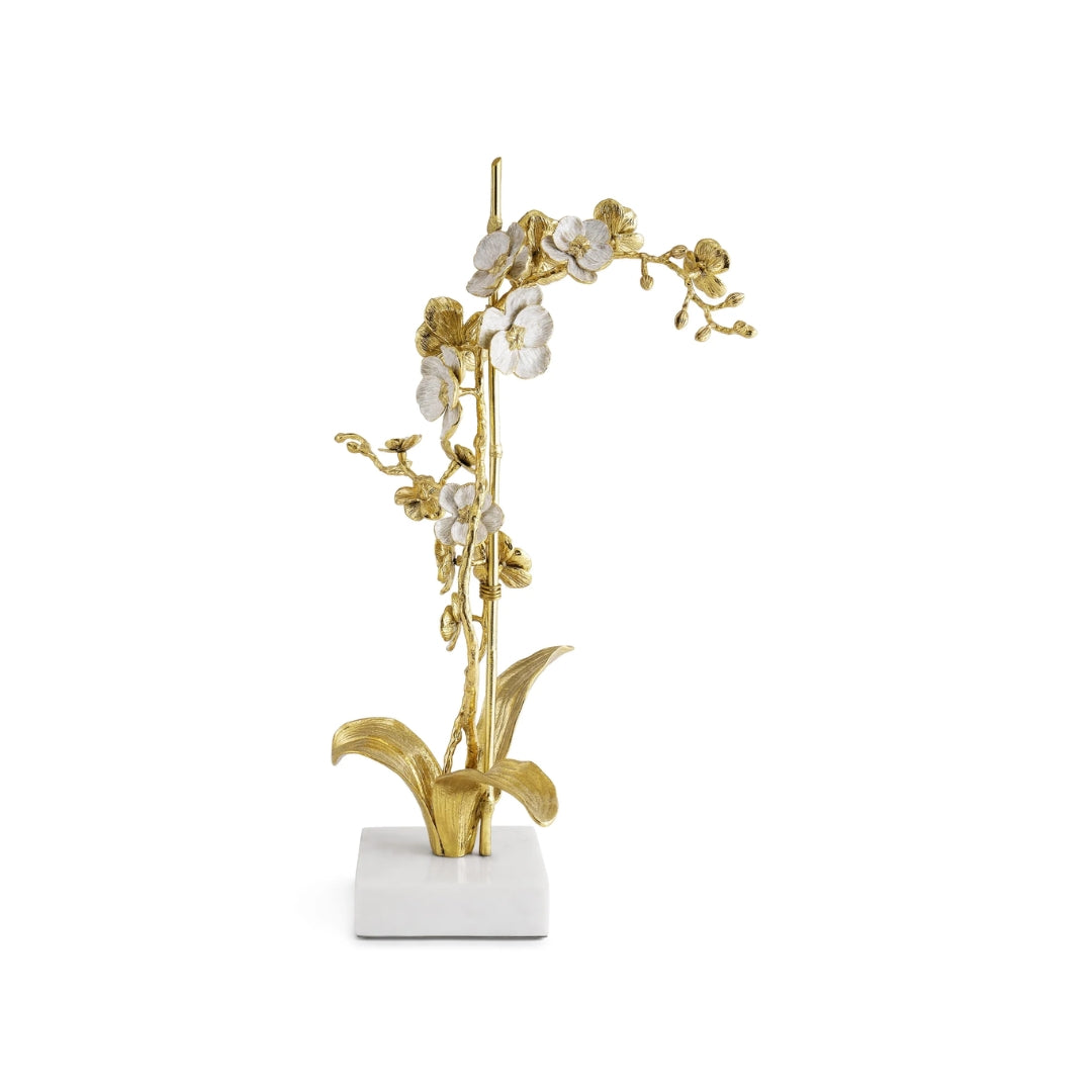 The Makatea Orchid Stem Sculpture introduces a note of poetic refinement to any luxurious setting. A slender stem rises with gentle curvature, adorned with stylized orchid blossoms crafted in warm golden brass and accented with soft white enamel, evoking petals touched by light. Each flower is shaped with careful attention to detail, suggesting purity, grace, and quiet glamour. The composition is grounded by a smooth marble base, its cool stone providing a beautiful counterpoint to the luminous metal above. This balance of delicacy and strength makes the piece an elegant accent for a console, sideboard, bedside table, or dressing area. Whether placed alone as a focal point or incorporated into a curated vignette with books and decorative objects, the Makatea Orchid Stem Sculpture lends timeless sophistication and a whisper of nature to contemporary, transitional, and classic interiors alike, elevating everyday spaces with its serene, sculptural presence.
